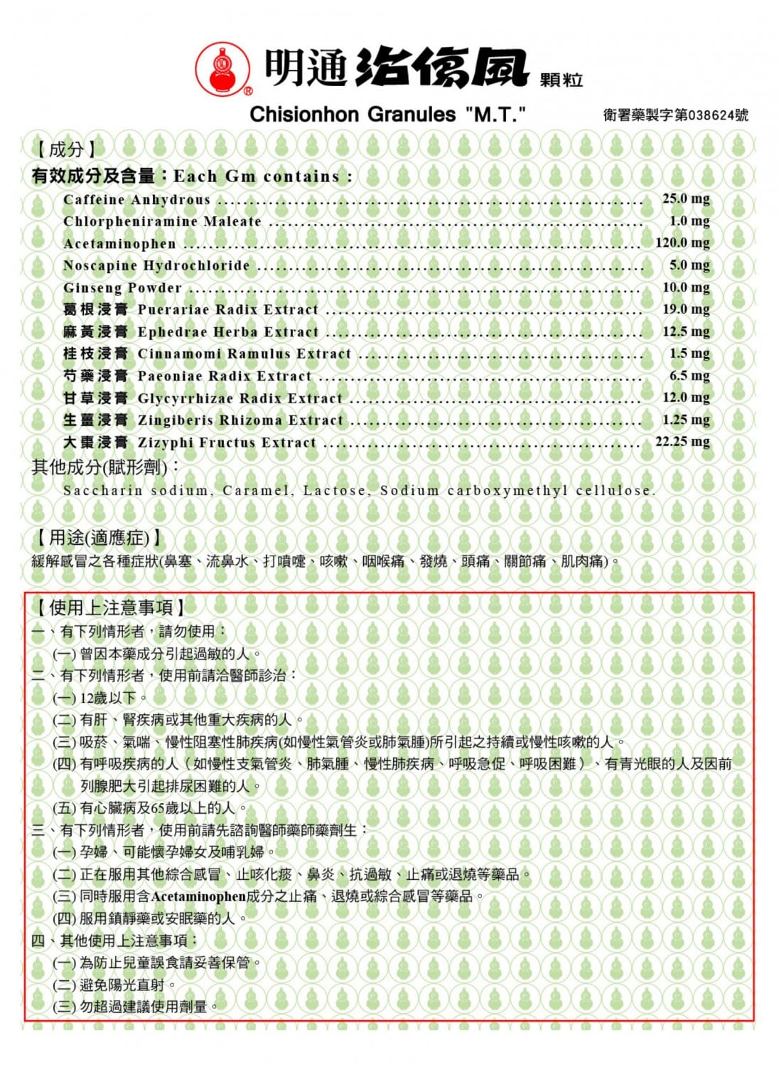 緩解感冒之各種症狀(鼻塞、流鼻水、打噴嚏、咳嗽、咽喉痛、發燒、頭痛、關節痛、肌肉痛)。